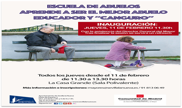La primera “Escuela de Abuelos” de la Comunidad de Madrid se llevara a cabo en Sevilla la Nueva. Se impartirá a lo largo de 20 horas distribuidas en 10 sesiones de 2 horas de duración cada una que tendrán lugar los jueves de 11.30 a 13.30 horas.