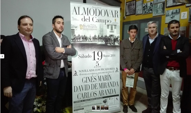 Almodóvar del Campo celebrará el próximo mes de marzo su feria taurina. Será el próximo día 19 de marzo cuando los aficionados al mundo taurino tendrán una cita con los mejores novilleros del momento. Hoy se ha presentado oficialmente la terna que compondrá el cartel taurino, formado por Ginés Marín, David de Miranda y Carlos Aranda.