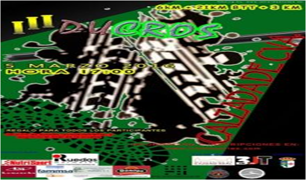 El próximo sábado 5 de Marzo de 2016 el «III Ducross Calzada de Calatrava» a las 17.00 en la Plaza de España. Es la tercera vez que se celebrará en nuestra localidad una prueba de este tipo, que aúna esfuerzo, sacrificio a la vez que espectáculo. La prueba consiste en realizar 6 km corriendo, a continuación 21 km en bicicleta todo terreno y para finalizar 3 km corriendo.