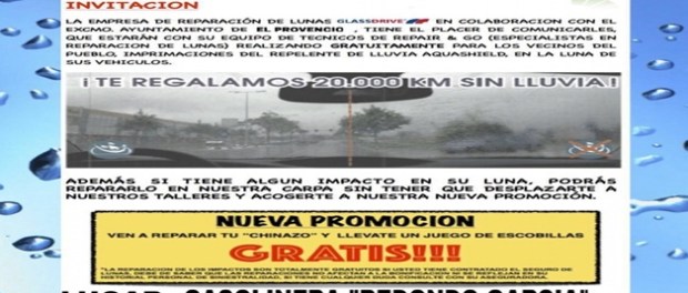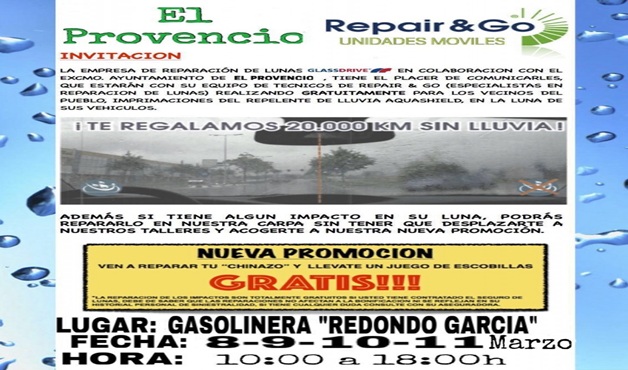 Desde mañana martes día 8 hasta el próximo viernes día 11 de marzo, en horario de 10 a 18 horas, la empresa de reparación de lunas GLASSDRIVE realizará imprimaciones de repelente de lluvia a los vehículos de todos aquellos vecinos que pueda interesar, de forma totalmente gratuita, en GASOLINERA REDONDO GARCÍA.
