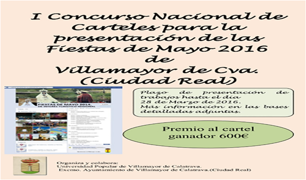 El ayuntamiento de Villamayor de Calatrava ha convocado el I Concurso Nacional de Carteles anunciadores de las Fiestas de Mayo 2016, declaradas por la Junta de Comunidades de Interés Turístico Regional, al que se podrán presentar todos los interesados, que deberán remitir sus originales al ayuntamiento, conforme a las bases aprobadas, para ser recibidos antes del próximo 28 de marzo.