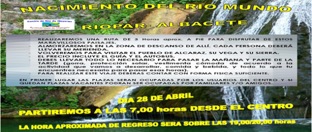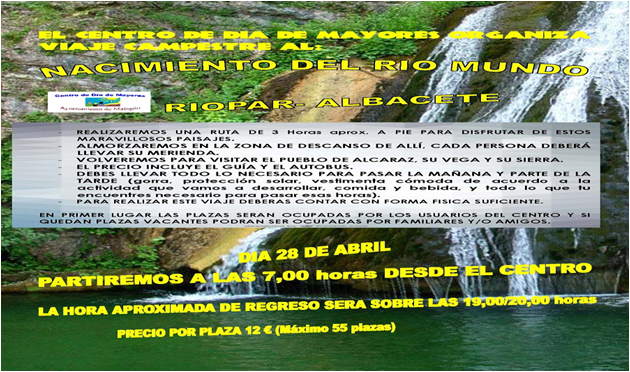 Malagón. Centro de Día de Mayores: Excursión al nacimiento del Río Mundo Publicado en 8 abril, 2016 por alcaldesapiedecalle en CIUDAD REAL, Malagón, MUNICIPIOS, SOCIEDAD // 0 Comentarios Comparte esto: Haz clic para compartir en X (Se abre en una ventana nueva) X Haz clic para compartir en Facebook (Se abre en una ventana nueva) Facebook Me gusta Cargando... Relacionado