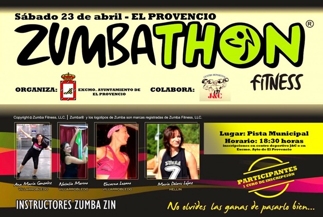 El sábado día 23 de abril, a las 18:30 horas en nuestra pista municipal, ¡gran ZUMBATHON en El Provencio! Evento organizado por nuestro Excmo. Ayuntamiento y con la colaboración del Centro Deportivo J&C, se realizará bajo la dirección de cuatro instructoras oficiales de zumba (ZIN).