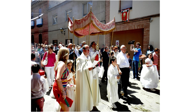 El acto procesional abre su comitiva con los monaguillos avisando al son de las campanas que la custodia con el cuerpo de Cristo se acerca. Le siguen los portadores de estandartes de las Hermandades de penitencia y gloria de nuestro pueblo y las bandas de música; un auténtico día de gozo y alegría.