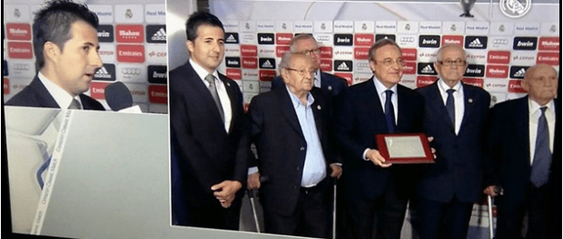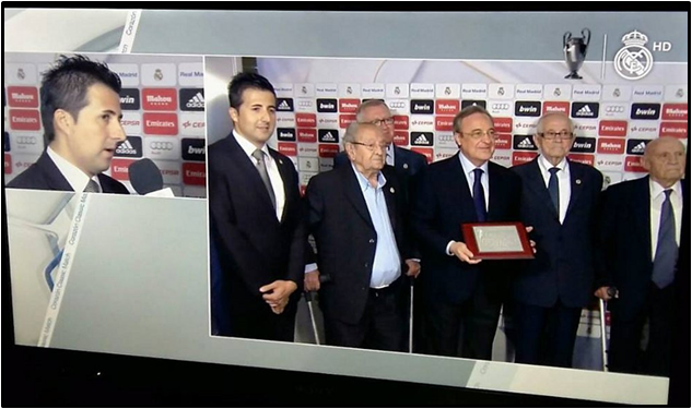 Antes de comenzar el partido Corazón Classic Match, Astillero hacía entrega a Florentino Pérez de una placa en agradecimiento por la recepción y por la consecución de la undécima Copa de Europa. Desde la peña del Real Madrid, se ha subrayado “la simpatía, el cariño y el trato exquisito brindado por Florentino Pérez con nuestros mayores”, algunos de ellos con 96 y 95 años de edad.
