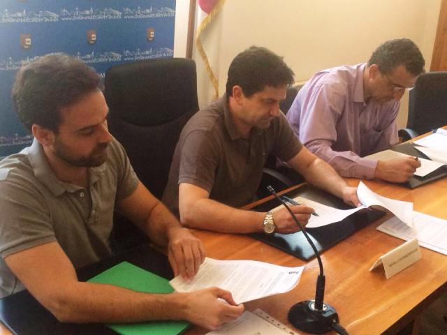 El alcalde de la localidad, Miguel Ángel Valverde, acompañado del concejal de deportes, Julián Alberto Rubio, junto al representante de la empresa encargada de los trabajos, Mondo Ibérico, ha firmado el contrato mediante el que Bolaños contará con un nuevo césped en el campo de fútbol municipal.