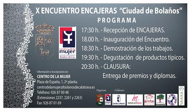 X encuentro de encajeras «Ciudad de Bolaños» Publicado en 19 agosto, 2016 por alcaldesapiedecalle en Bolaños, CIUDAD REAL, MUNICIPIOS, SOCIEDAD // 0 Comentarios El próximo viernes 2 de Septiembre tendrá lugar el X ENCUENTRO DE ENCAJERAS «CIUDAD DE BOLAÑOS», el plazo de inscripción para poder participar el Encuentro está abierto hasta el 30 de agosto. Más información: CENTRO DE LA MUJER. Comparte esto: Compartir en X (Se abre en una ventana nueva) X Comparte en Facebook (Se abre en una ventana nueva) Facebook Me gusta Cargando... Relacionado