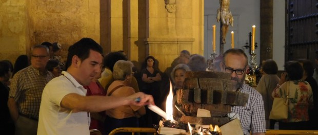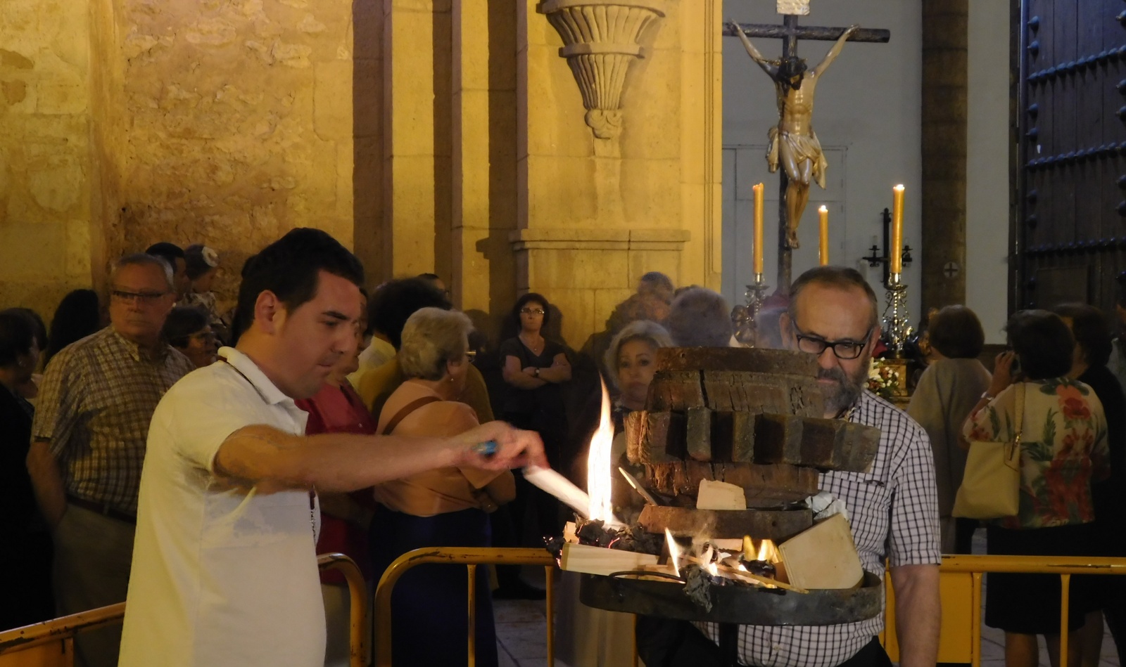 Unas 200 personas se dieron cita este martes en la Plaza de San Pedro para asistir a la ‘Quema de Cubos’ que cada 13 de septiembre, víspera de la festividad de la Exaltación de la Cruz, celebra la Hermandad del Cristo del Consuelo. Tras la finalización del triduo, y con el Cristo en la puerta de la iglesia de San Pedro, el presidente de la Hermandad, Alberto Honrado, y el Hermano Mayor, Valeriano Díaz, fueron los encargados de encender el cubo, con los acordes del Coro Romero de la Virgen de la Cabeza ambientando la noche.
