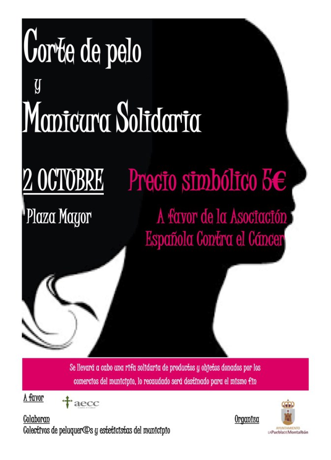Desde la Concejalía de Servicios Sociales se organiza, en colaboración con el colectivo de peluquerias y centros de estética, una jornada solidaria, a favor de la Asociación Española contra el Cáncer. En dicha jornada los citados colectivos pondrán a disposición de todos nosotros su trabajo, por un precio simbolico, en beneficio de la AECC.