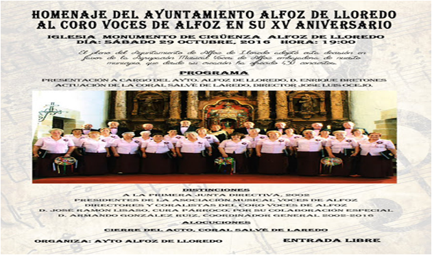El Ayuntamiento de Alfoz de Lloredo homenajeará el sábado al Coro Voces de Alfoz, con motivo del XV aniversario, mediante un acto que tendrá lugar a las siete de la tarde en la Iglesia de Cigüenza, al acudirá la Coral Salvé de Laredo.