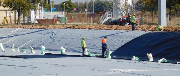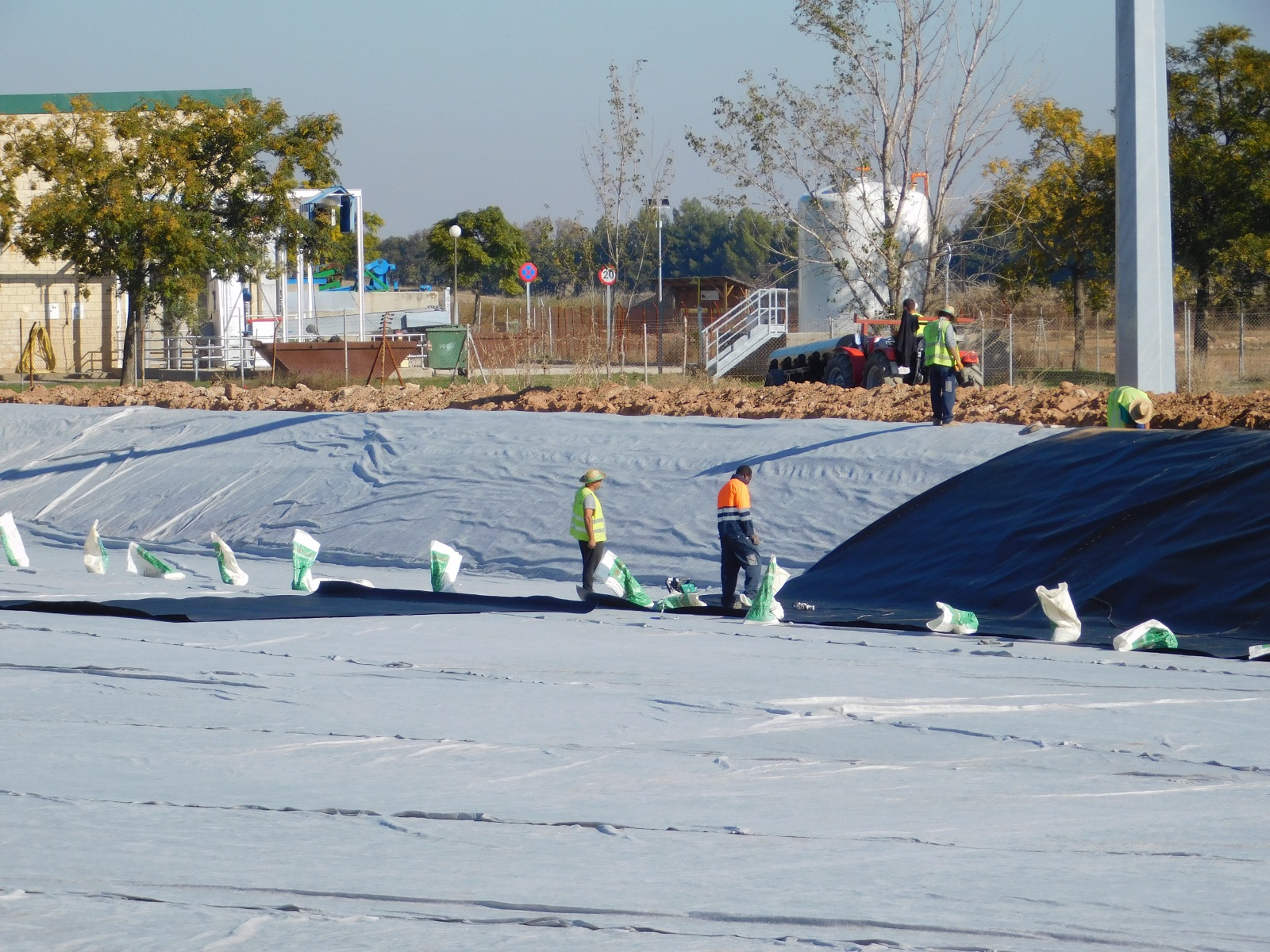 Fisac ha explicado que en estos momentos, tras extender una primera capa de geotextil, se está colocando sobre ésta, en rollos de seis metros, «una lámina impermeable de polietileno de alta densidad de milímetro y medio que va electro-soldada».