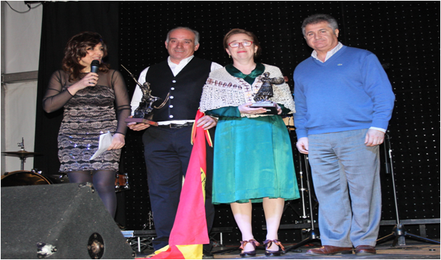 Tras las palabras del alcalde, los Capitanes 2017, portando la tradicional bandera, subieron al escenario y recibieron una escultura de Don Quijote y Dulcinea en nombre del Ayuntamiento y de todo el pueblo de Miguel Esteban.