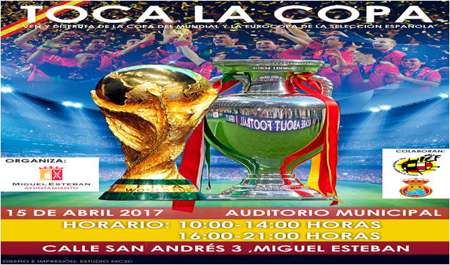Para completar la jornada deportiva del sábado 15 de abril, se expondrán la Copa del Mundo y las dos Eurocopas en el Auditorio Municipal, con horario de 10.00 a 14.00 horas y 16.00 a 21.00 horas. De esta forma, los migueletes tendrán la posibilidad de hacerse una foto junto a estos premios de los títulos conquistados por la Selección Española.