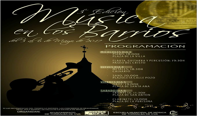 Se trata de un interesante programa de conciertos que llega este año a su tercera edición, y que se desarrollará en diferentes marcos de la población, mostrando el gran impulso musical que vive y ha vivido Torralba desde hace más de un siglo (el año pasado se celebró el 125 aniversario de su banda de música).