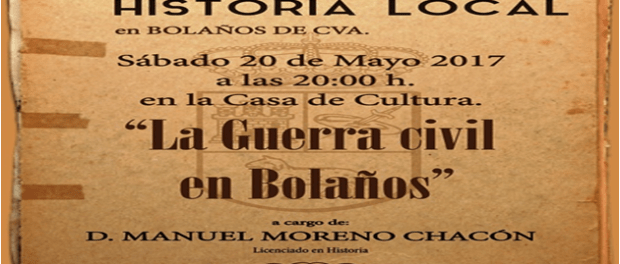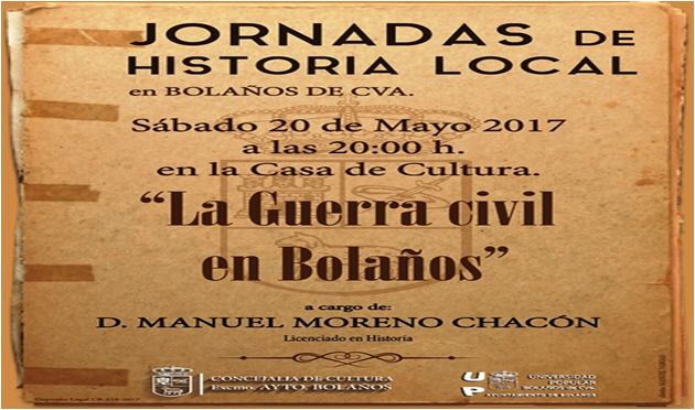 Las Jornadas de Historia Local, organizadas por la Concejalía de Cultura del Ayuntamiento de Bolaños, concluirán el próximo 20 de mayo con una conferencia sobre la Guerra Civil española.