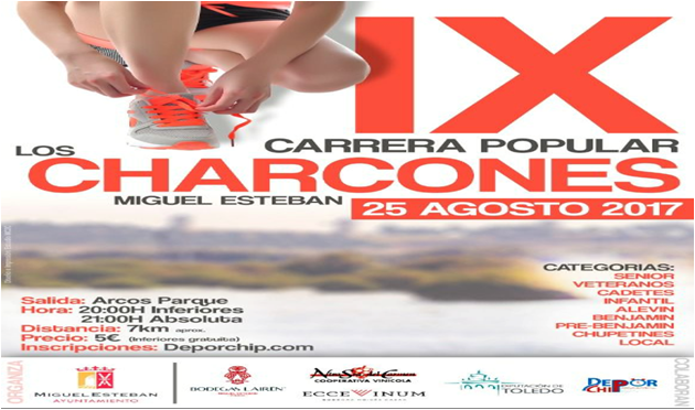 Miguel Esteban celebrará, el próximo 25 de agosto la IX edición de la Carrera Popular ‘Los Charcones’. Organizada por el Ayuntamiento miguelete, esta prueba deportiva tiene como principal objetivo el disfrute de toda la familia, por lo que incluye diferentes categorías y recorridos.