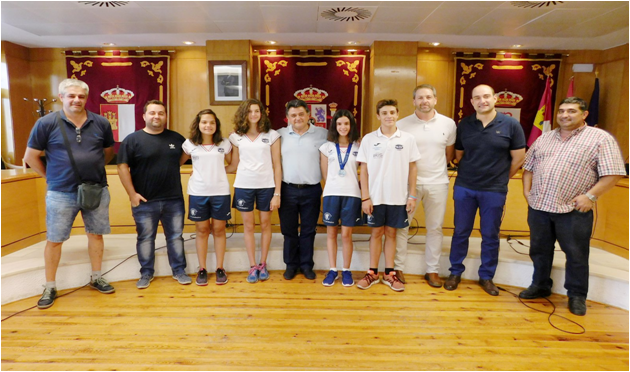 El alcalde de Daimiel, Leopoldo Sierra, y el concejal de Deportes, Román Ortega, recibían este viernes en el Salón de Plenos del Ayuntamiento a los componentes del Club Natación Daimiel que participaban el pasado mes en los campeonatos de España, en los que Marta Cabanes se proclamó subcampeona en los 200 espalda categoría infantil, mientras que Jhonatan de la Morena conseguía subirse al tercer cajón en 200 mariposa en categoría alevín. También acudieron a la recepción el resto del equipo participante en las pruebas: Laura Calahorra, Jesús Villar y Valeria Moya, además de Lorenzo Sobrino y Raúl Utrilla como entrenadores, e Isaac Cabanes, como presidente del Club.