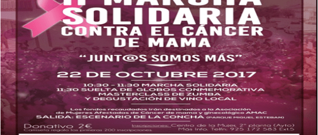 La II Marcha solidaria contra el cáncer de mama arrancará el domingo 22 de ocutubre a las 10,30 horas desde el escenario de la Concha del parque de Miguel Esteban. La marcha a pie, que tendrá una duración de una hora, finalizará con una suelta de globos conmemorativa.