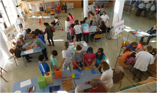 El centro de mayores continúa con la celebración de su 20 aniversario. Este martes, los alumnos de sexto de Educación Primaria de los distintos centros educativos de la localidad han participado con los mayores en la actividad intergeneracional ‘Ganas de Vivir’, gracias a la que han podido experimentar en primera persona las actividades físicas, psíquicas y sensoriales que se llevan a cabo en el día a día del centro. Así lo ha explicado la trabajadora social Lusia Tébar, que señalaba que el recorrido comienza con la proyección de un vídeo lúdico en el que de forma divertida se explican las terapias con las que se trabajan con nuestro mayores. Posteriormente pasan al hall donde se reparten en tres stands, cada uno correspondiente a una terapia en los que se turnan cada ocho minutos.