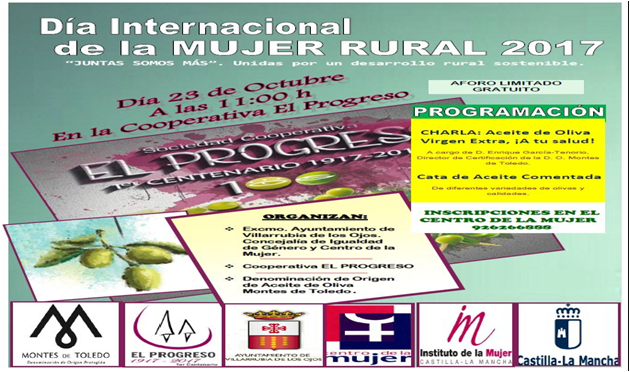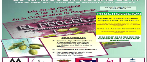 El Ayuntamiento de Villarrubia de los Ojos (Ciudad Real), a través de su Concejalía de Igualdad de Género y su Centro de la Mujer, celebrará este año el Día Internacional de la Mujer Rural con actividades que girarán en torno al aceite de oliva virgen extra. La iniciativa se ha organizado en colaboración con la Cooperativa El Progreso, con motivo de su Centenario.