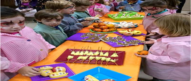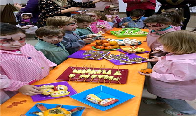 Cabe referir que justo antes, las maestras en sus respectivas aulas habían pintado las mandarinas a modo de calabaza y decorado los plátanos como fantasmas. Y mientras un primer grupo de madres preparaban el resto del desayunocomo escobas de brujas con queso, murciélagos de crema de cacao, ataúdes de jamón york, manzanas momificadas, el otro iba pintando las caras de los pequeños alumnos de vampiros y vampiresas.