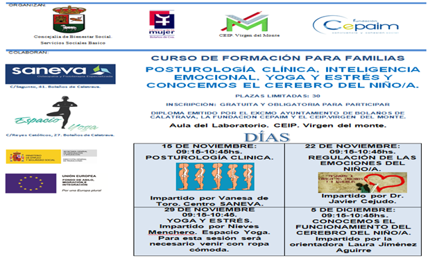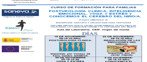 Bolaños de Calatrava. Curso de formación para familias. Talleres de posturología clínica, inteligencia emocional, yoga y estrés y conocemos el cerebro del niño