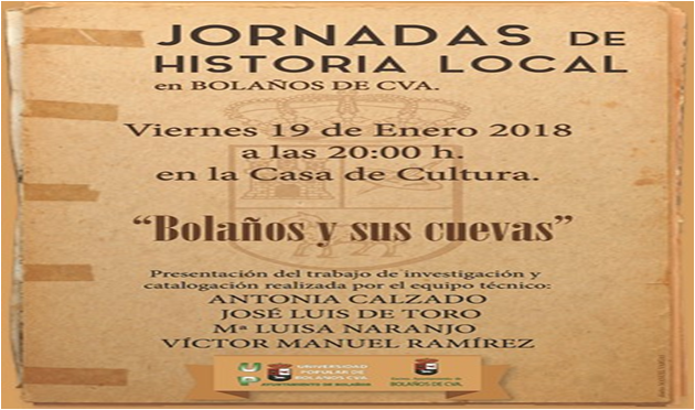 Dentro de las jornadas de Historia Local programadas por la Universidad Popular, el próximo Viernes, día 19, tendrá lugar la charla denominada «BOLAÑOS Y SUS CUEVAS» que servirá para presentar el trabajo de investigación y catalogación desarrollado recientemente por el equipo técnico contratado por el Ayuntamiento de Bolaños, integrado por Antonia Calzado, José Luis de Toro, Mª Luisa Naranjo y Víctor Manuel Ramírez.