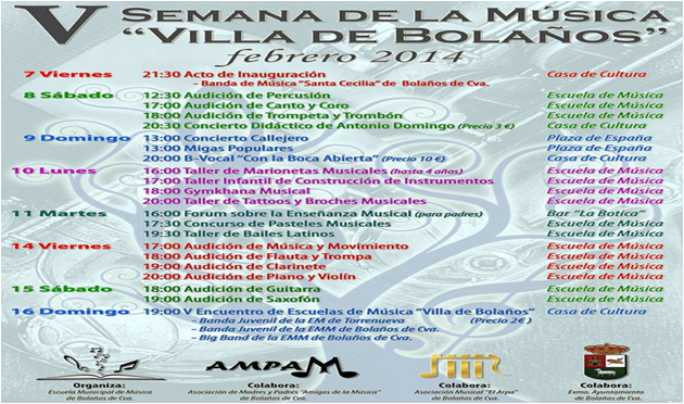 Para todos los públicos se han programado diez audiciones por especialidades, destacando el encuentro de clarinetes entre las escuelas de Bolaños y Torrenueva y un concierto conjunto entre la Banda de Música de la Localidad y la Banda Juvenil. No faltarán las migas populares y el clásico concierto callejero. Además la concejalía de cultura ha añadido a la programación un concierto de primer nivel, el espectáculo “Con un canto en los dientes” de los zaragozanos b-vocal a un precio de diez euros.
