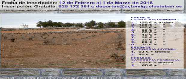 El concejal de Agricultura, Emilio Lara, explicaba que “este concurso pretende ser un homenaje a los agricultores y una puesta en valor de tareas tradiciones vinculadas al viñedo, un cultivo que en Miguel Esteban es básico y que constituye un aporte fundamental para la economía local”. Asimismo, recordaba que el concurso está abierto a mujeres y a jóvenes y animaba a todos los podadores y aficionados al campo a “asistir a esta cita con la poda tradicional en la que sólo pueden utilizarse herramientas de siempre como tijeras o hachas”.