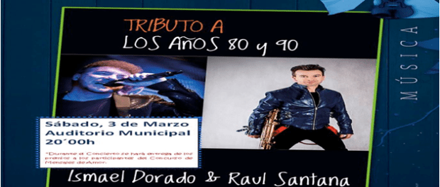 El Auditorio Municipal de Miguel Esteban, acogerá este sábado, 3 de marzo, la actuación del saxofonista Ismael Dorado y del guitarrista y cantante Raúl Santana. ‘Tributo a los años 80 y 90’ es el nombre de este concierto que comenzará a las ocho de la tarde y que está organizado por la Concejalía de Cultura del Ayuntamiento miguelete.