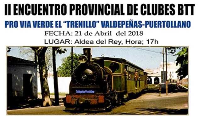 El Ayuntamiento de Aldea del Rey acogerá el sábado 21 de abril el segundo encuentro provincial de clubes de bicicletas todoterreno (BTT) para seguir perseverando en la apertura de la Vía Verde ‘El Trenillo’, entre Valdepeñas y Puertollano y cuyo trazado discurrirá en parte por la población aldeana.
