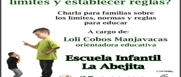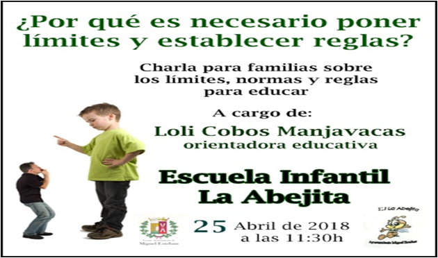 La charla ‘¿Por qué es necesario poner límites y establecer reglas?’ tendrá lugar el próximo 25 de abril, a las 11,30 horas en la Escuela Infantil ‘La Abejita’ y correrá a cargo de la orientadora del Colegio Cervantes, Loli Cobos. La experta en educación y orientación explicará cómo las normas contribuyen a aumentar la seguridad en los hijos. El objetivo fundamental de un orientador es el asesoramiento pedagógico, la identificación de las necesidades educativas y la orientación educativa y vocacional.