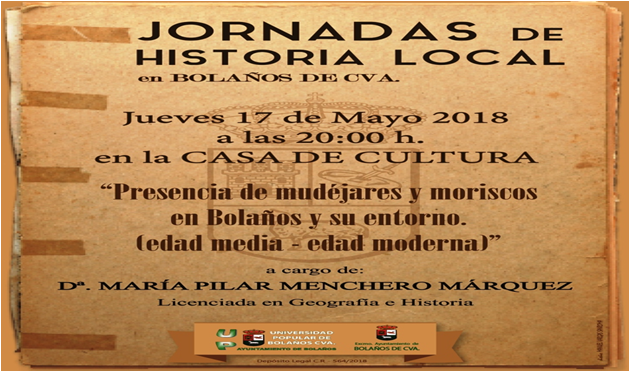 La jornada con el título «PRESENCIA DE MUDEJARES Y MORISCOS EN BOLAÑOS Y SU ENTORNO» (EDAD MEDIA- EDAD MODERNA) correrá a cargo de Pilar Menchero Marquez, Licenciada en Geografía e Historia.