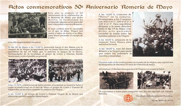 Con motivo del 50 Aniversario, “este año están invitados representantes de las 18 villas de la que es Patrona, la Virgen de la Sierra, villas de la Orden de San Juan de Jerusalén, tanto a la Función Religiosa como a la Procesión; y el grupo de Coros y Danzas de Villarrubia de los Ojos acompañará a la Virgen y le cantará los Mayos, para que sea más significativo”, añade Díaz Moreno.