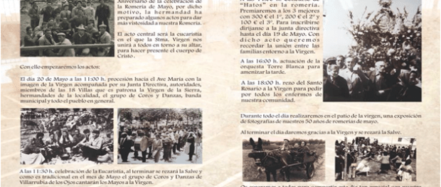 Este año se cumple medio siglo desde que Villarrubia de los Ojos (Ciudad Real) comenzó a celebrar su Romería de la Virgen de la Sierra, el tercer domingo de mayo, aniversario que este año se celebrará con diversas actividades, como un Concurso de Hatos y una exposición de fotos, entre otras.