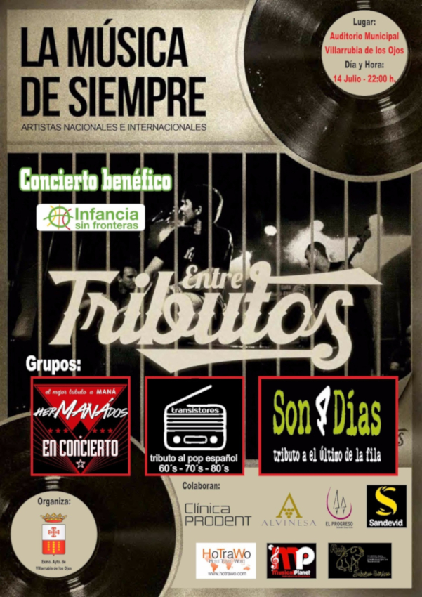 El Auditorio Municipal de Villarrubia de los Ojos (Ciudad Real) se llenará de música el sábado 14 de julio por la noche de la mano de la gira “Entre Tributos” a beneficio de Infancia sin Fronteras.