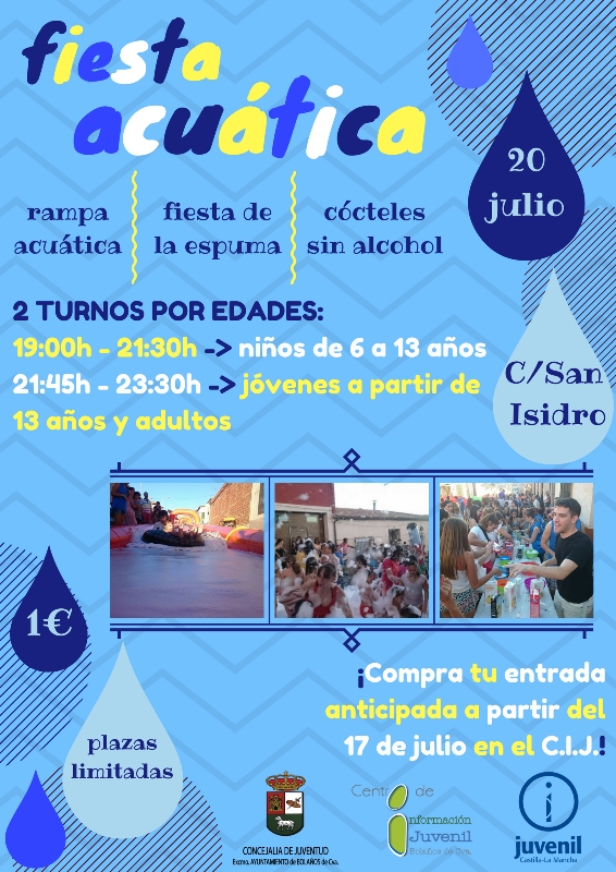 Un año más, desde la Concejalía de Juventud del Ayuntamiento de Bolaños de Calatrava seguimos apostando por las actividades de ocio saludable durante las noches de verano, por ello, se ha organizado la III fiesta acuática que tendrá lugar el día 20 de julio en la calle San Isidro con dos turnos por edades. Niños de 6 a 13 años desde las 19 hasta las 21:30 y resto de jovenes y adultos, a partir de las 21:30 hasta las 23:30.