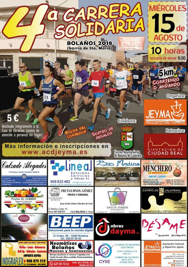 El día 15 de agosto de 2018 a partir de las 10 de la mañana (9:30 para recoger el dorsal) se celebrará en el Barrio de Santa María de Bolaños de Calatrava (c/ Ramón y Cajal cruce con c/ Cristo, salida y meta) la IV Carrera Solidaria organizada por la Asociación Cultural y Deportiva Jeyma, en colaboración con el Ayuntamiento de Bolaños de Calatrava y patrocinio de la Diputación Provincial de Ciudad Real, cuya inscripción irá destinada a ayudar a la Casa de Abraham, centro de atención para personas sin hogar.
