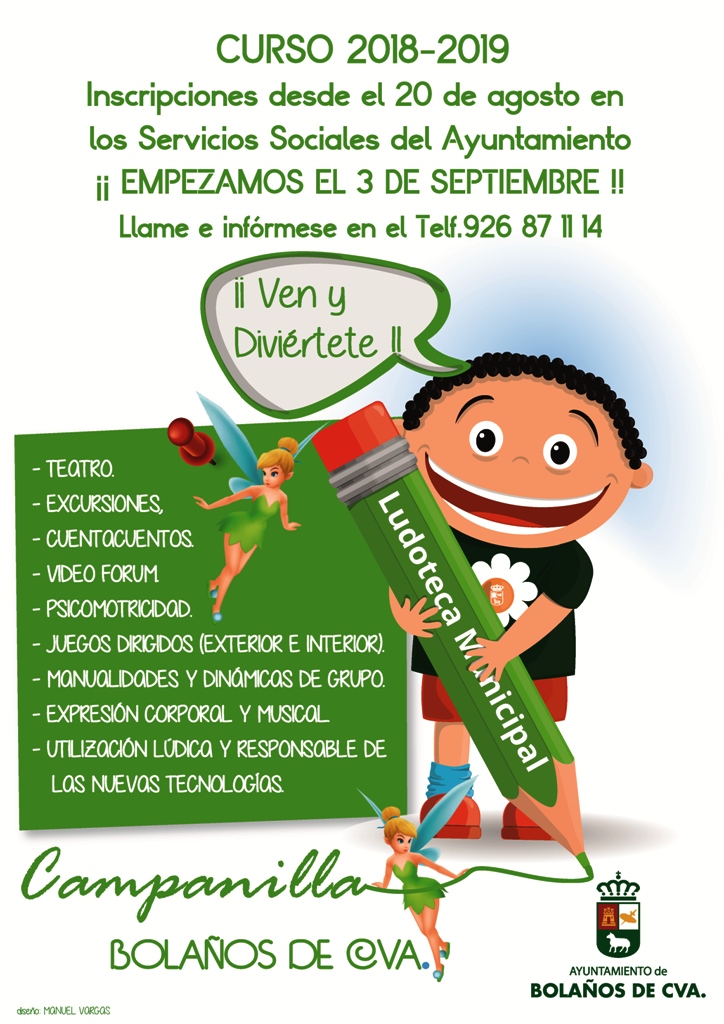 La ludoteca Campanilla abre otro año más el periodo de inscripción desde el próximo 20 de Agosto con el fin de agilizar el orden de entrada al Servicio. Las inscripciones se deben solicitar y presentar en el área de Servicios Sociales del Ayuntamiento.