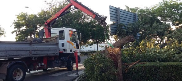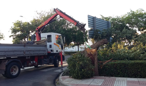 La tormenta que cayó con fuerza entre las nueve media y las once de la noche de este jueves en Daimiel ha hecho mella en algunas zonas verdes del municipio. Los principales daños se han registrado en el Paseo del Carmen donde las fuertes rachas de viento “partieron por la mitad” un árbol de grandes dimensiones en la rotonda de acceso a las ‘100 viviendas’ y desgajaron ramas de otro al inicio del paseo, como señalaba el concejal de Parques y Jardines, Ricardo Sáez. A primera hora de la mañana del viernes, los operarios municipales comenzaron a limpiar los restos vegetales y se decidía retirar el árbol del que cayeron las ramas porque “aunque aparentemente parecía sano, hemos visto que tiene el tronco podrido por completo”.