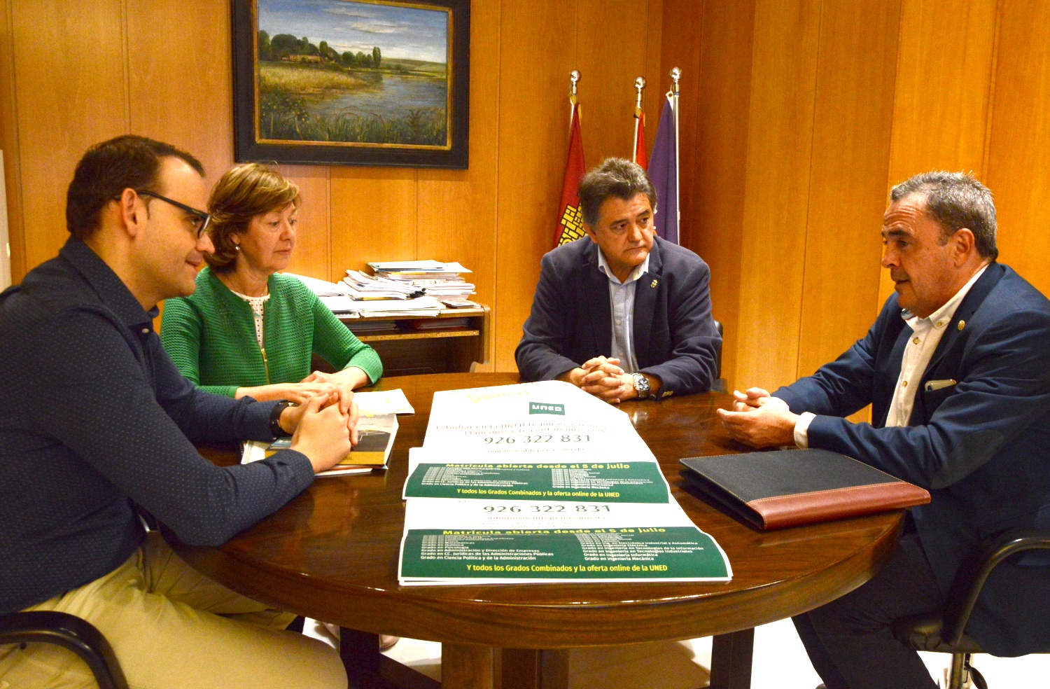 El director del Centro Asociado de la UNED de Ciudad Real, Pedro Jesús Sánchez Muñoz, se ha reunido este lunes con el alcalde de Daimiel, Leopoldo Sierra, el teniente de Alcalde, Jesús David Sánchez de Pablo, y la coordinadora de Cultura, Josefina Villegas, dentro de la campaña informativa denominada 'Estudiar en la UNED te puede cambiar la vida', que promociona su oferta educativa por los municipios de la provincia en los últimos meses.