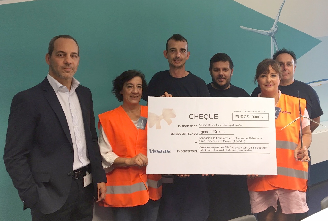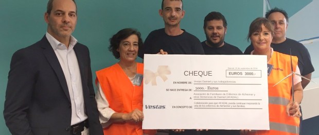 La empresa y los trabajadores de ‘Vestas’ han donado a la ‘Asociación de familiares de enfermos de Alzheimer y otras demencias de Daimiel’ (AFADAL) la cantidad de 3.000 euros. Todo surge a raíz de la instalación en la fábrica de una máquina expendedora de agua cuyo coste por botella (1 euro) se decidió por parte de los trabajadores destinar a una asociación benéfica, según ha explicado en Radio Daimiel la presidenta de AFADAL, Pilar Estudillo. Un gesto al que se unió la empresa con el compromiso de aportar el doble de lo que se recaudara, lo que dio como resultado la cantidad final. Tras esto, trabajadores y empresas escogieron a AFADAL como beneficiaria del dinero, un detalle que agradecía profundamente Estudillo.