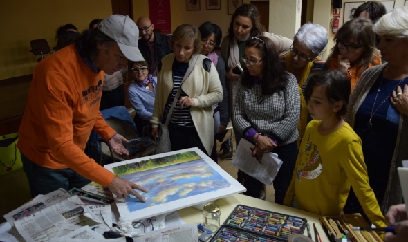 El mal tiempo ha truncado los planes de salir a pintar al aire libre y la sesión de tarde también ha sido bajo cubierto. Pero lo importante era escuchar y tomar nota de los consejos de Moya que, recalcaba, que más allá del arte innato, el cincuenta por ciento es oficio, hay que aprenderlo, como dijeron Renoir o Van Gogh, indicaba.