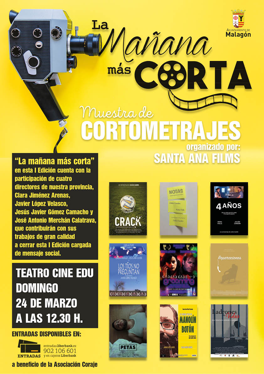 ¿Qué es “La mañana más corta”? “La mañana más corta” es una Muestra de Cortometrajes Itinerante organizada por “SANTA ANA FILMS, S.L.”, que cada año tratará de acercar el mundo del cortometraje a los habitantes de los distintos municipios de la provincia de Ciudad Real, potenciando el sector cinematográfico en Castilla la Mancha y más concretamente en nuestra provincia, siendo su máxima prioridad promocionar las obras de los diferentes autores locales. “La mañana más corta” destinará en esta I Edición los fondos que se obtengan en el rodaje de “Soledad”, el nuevo cortometraje producido por “SANTA ANA FILMS, S.L.”, escrito por José Antonio Merchán.