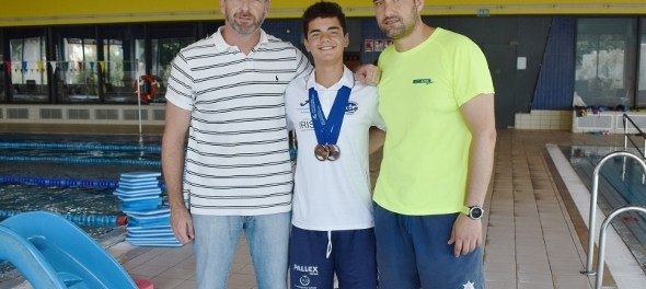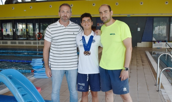 El nadador daimieleño, Alejandro García de la Galana Gallego, regresaba el miércoles por la tarde a la localidad con dos medallas de bronce que identificaban su brillante actuación en el Campeonato de España Infantil de Verano celebrado en Barcelona. Con apenas unas horas de descanso, y tras la preceptiva bienvenida de amigos y familiares en su aterrizaje, García de la Galana ha sido recibido este jueves por sus compañeros y equipo técnico deportivo en el Complejo de la Piscina Climatizada. Allí le esperaban para darle la enhorabuena por los logros de los últimos días, puesto que, al margen de las medallas, ha logrado mejorar todos sus tiempos en las cinco pruebas disputadas.