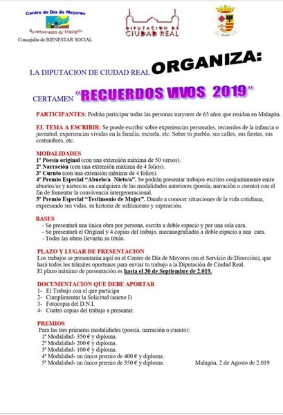Un año más desde el Centro de Mayores, puedes participar en el Certamen «Recuerdos Vivos» que organiza la la Concejalía de Bienestar Social del Ayuntamiento de Malagón en la colaboración con la Diputación Provincial.