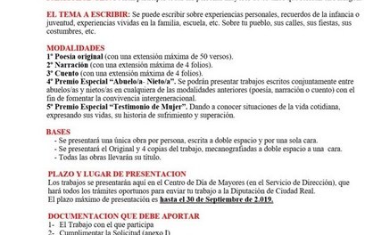 Escribe tus experiencias personales, tus recuerdos, tu niñez… puedes hacerlo en formato cuento, poesía, narración… lo traes al Centro y te lo enviamos para que puedas participar y optar a los premios, si tienes 65 años o más años…