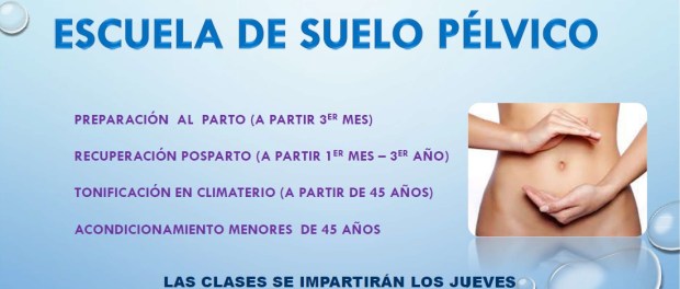 Bajo las directrices de la fisioterapeuta especializada Elena Calcerrada Lara, en la Escuela de Suelo Pélvico se impartirán las clases los jueves por la tarde durante el primer trimestre a partir de octubre, divididas en cuatro grupos: preparación al parto (a partir del tercer mes); recuperación posparto (a partir del primer mes), tonificación en climaterio a partir de los 45 años y acondicionamiento para menores de 45 años. El precio es de 12 euros.