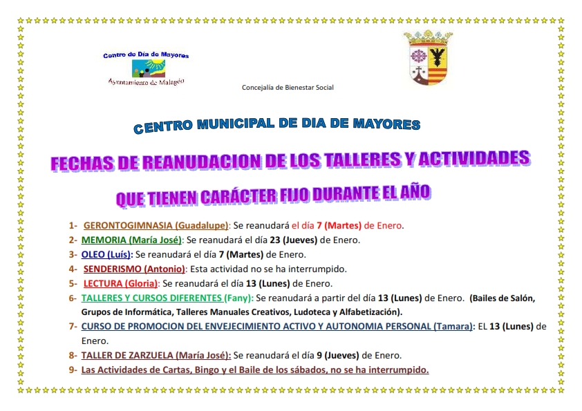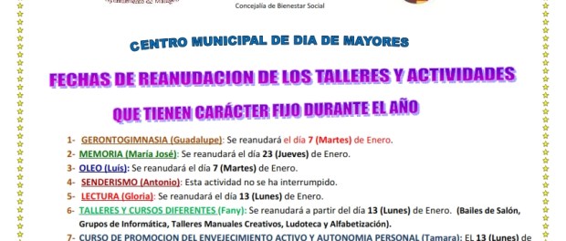 Tras el parón navideño, se reanudan los cursos del Centro de Día de Mayores de Malagón. A continuación ponemos a su disposición las fechas de reanudación de los mismos en formato pdf.