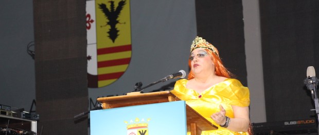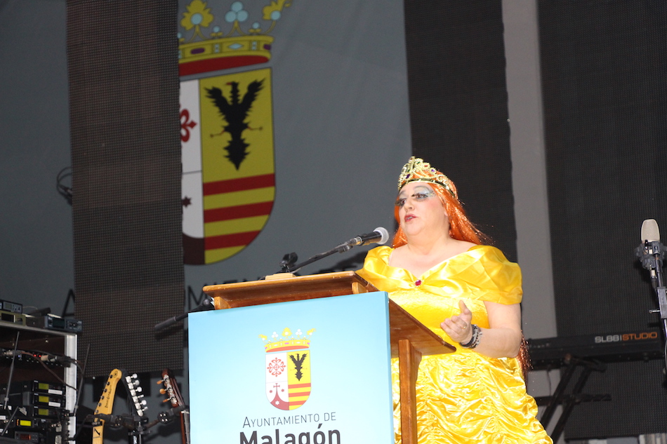 El acto continuaba a un ritmo frenético y al escenario subió la protagonista de la noche, la pregonera Mamen Tapiador, que disfrazada de “Bella” ( un personaje de Disney) fue desgranando a modo de anécdotas su largo periplo carnavalero en Malagón. Animó a todos los vecinos y visitantes a participar en nuestro carnaval y nos hizo reír a todos porque Mamen es la alegría personificada y ayer pudo trasladar un poco de esta alegría a todos nosotros.